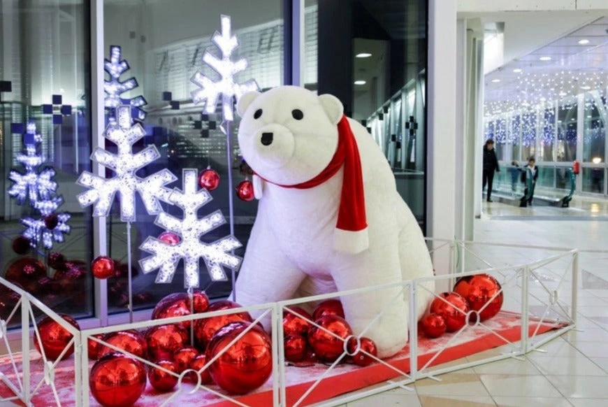 Patrons of all ages will enjoy the charming 6′ Polar Bear. Festive in his red and white scarf, he’s an irresistible addition to your winter wonderland Santa set or holiday displays.
