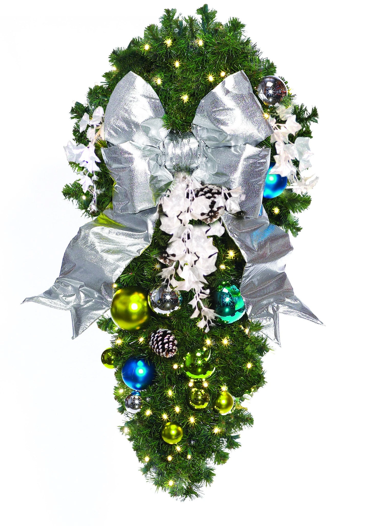 A gorgeous Coastal Spray featuring tropical-colored ornaments and a stunning 18″ Silver Mylar Structural Bow. 150 Warm White LED Miniature Lights add the perfect amount of dazzle.