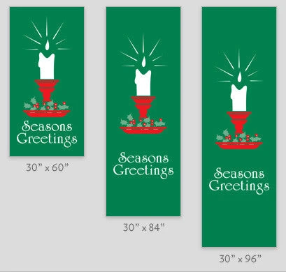 Brighten the Holidays. Full color screen print featuring white ink and red inks on sea grass green marine acrylic fabric. Double-sided banner; same art both sides. Available in the following sizes as a stock item:
